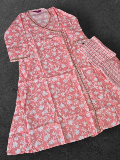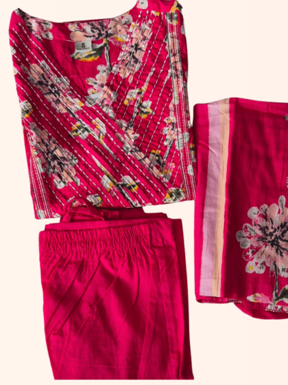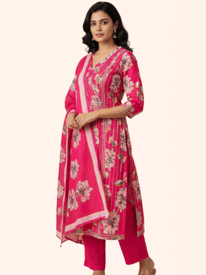 Fuchsia V-Neck Floral Pleated Kurti Set