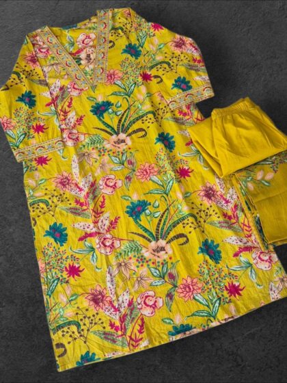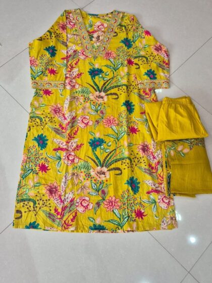 Cotton Marigold V-Neck Floral Print Straight Kurti Set