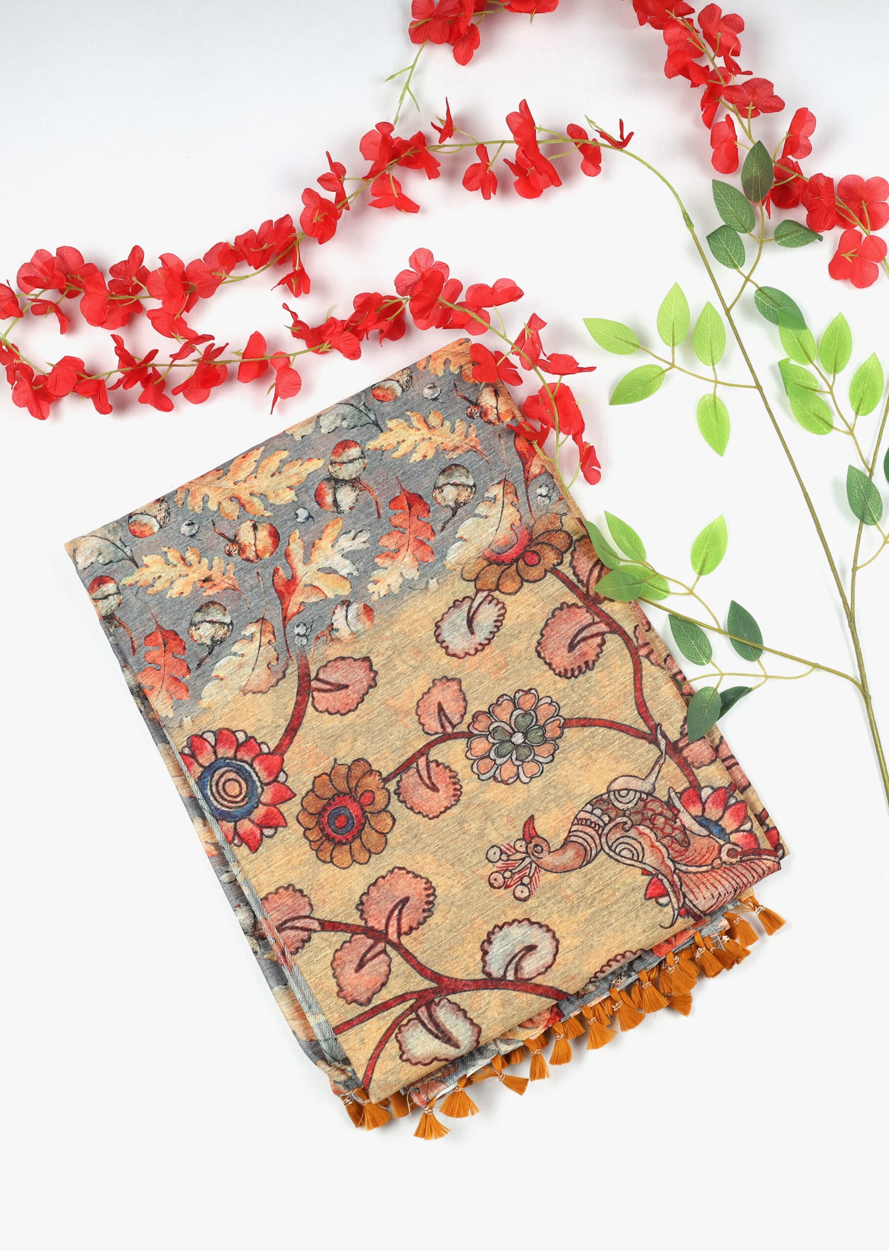 / Beige Jute Silk Saree with Abstract & Figurative Print