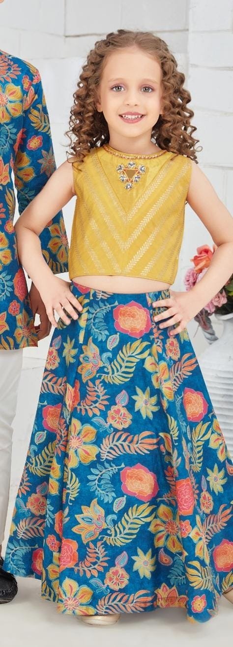 V neck blouse with floral Printed skirt with pretty combinations of blue and yellow