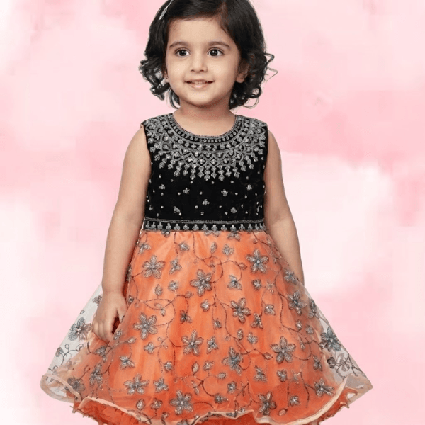 Rust Orange Grand Party Frock with Heavy Embellished Black Yoke