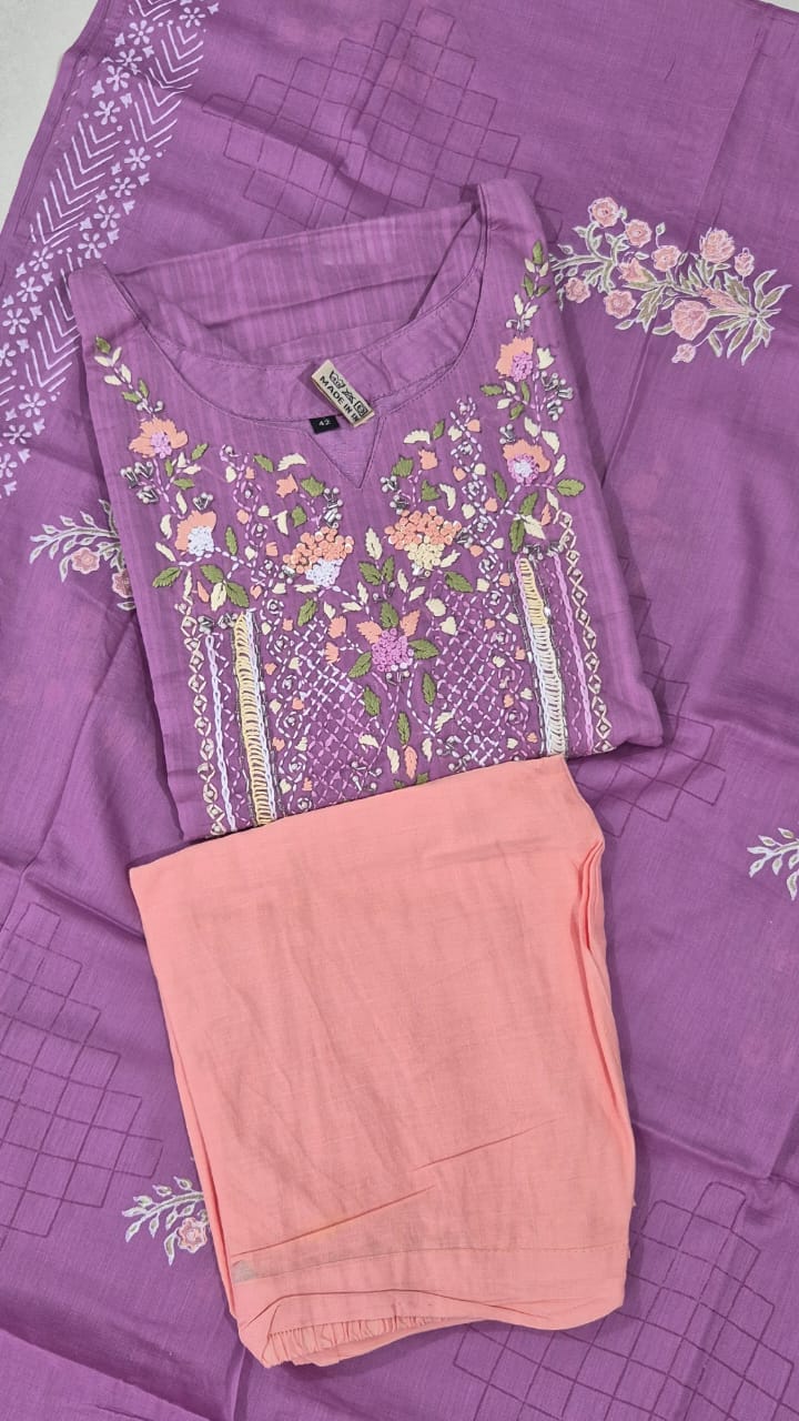 Chanderi cotton kurti set with thread embroidery and lining.Contrast bottom and dupatta