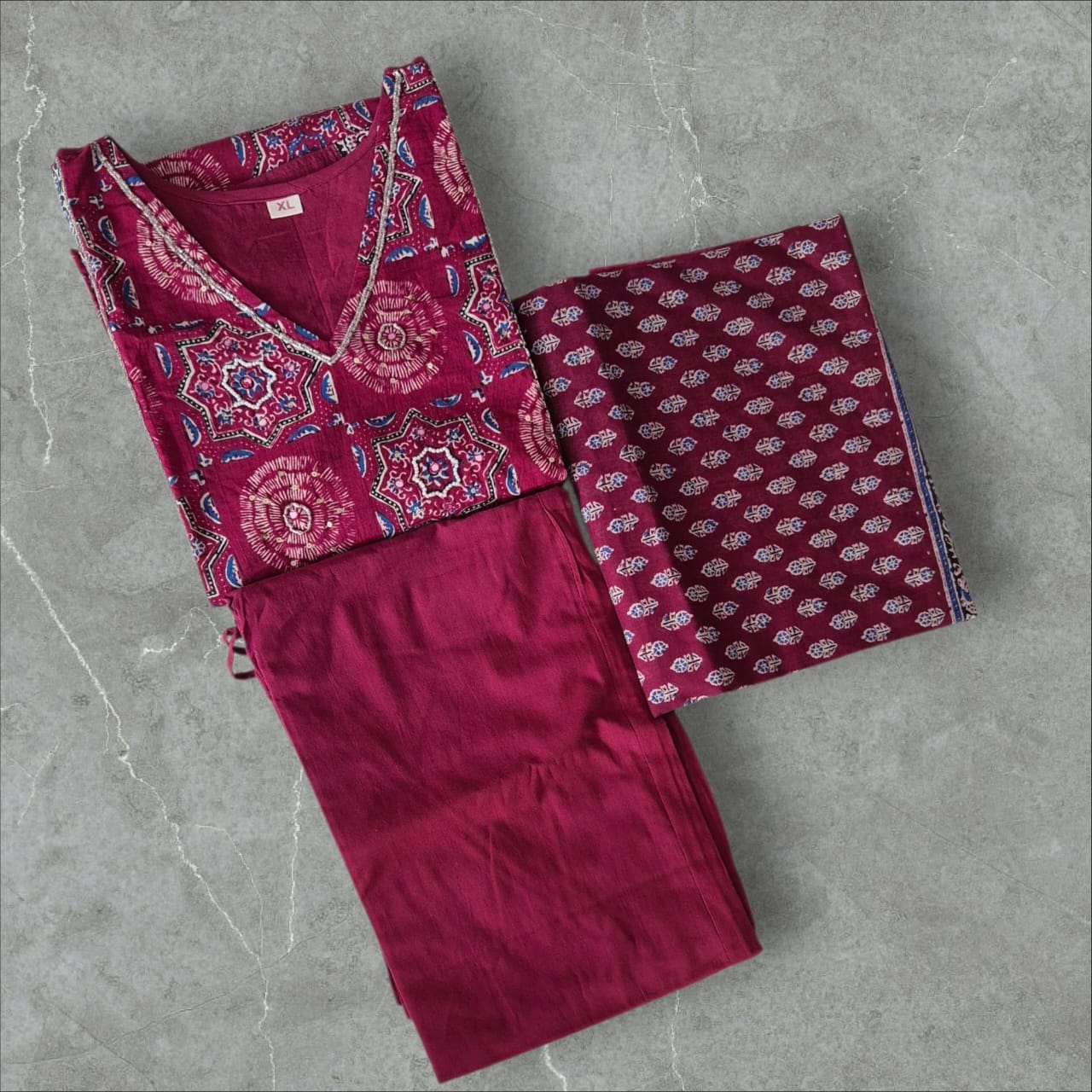 Pure cotton kurti sets V neck with bottom and dupatta.