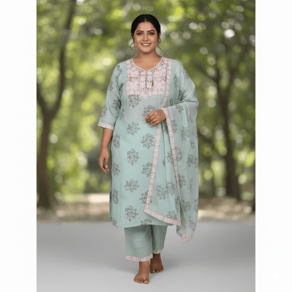 Be the first to review “Mint Green Mal Chanderi Kurti Set with Delicate All-Over Print”