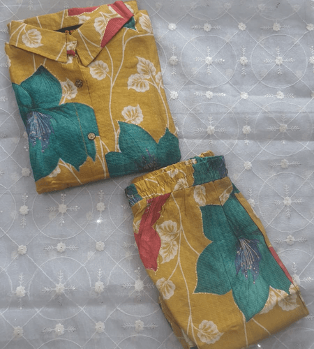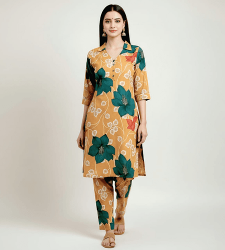 Be the first to review “Mustard Yellow Big Floral Print Co-ord Set with Collar Neck”