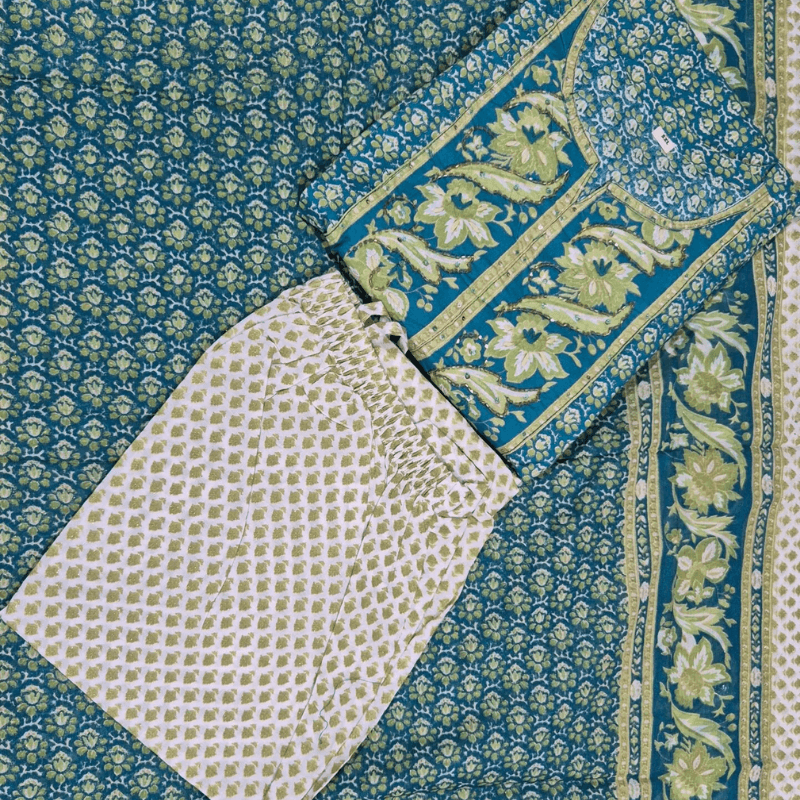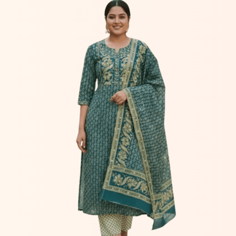 Be the first to review “Pure Cotton Teal Foil Print Anarkali Set with Embroidered V-Yoke” Cancel reply