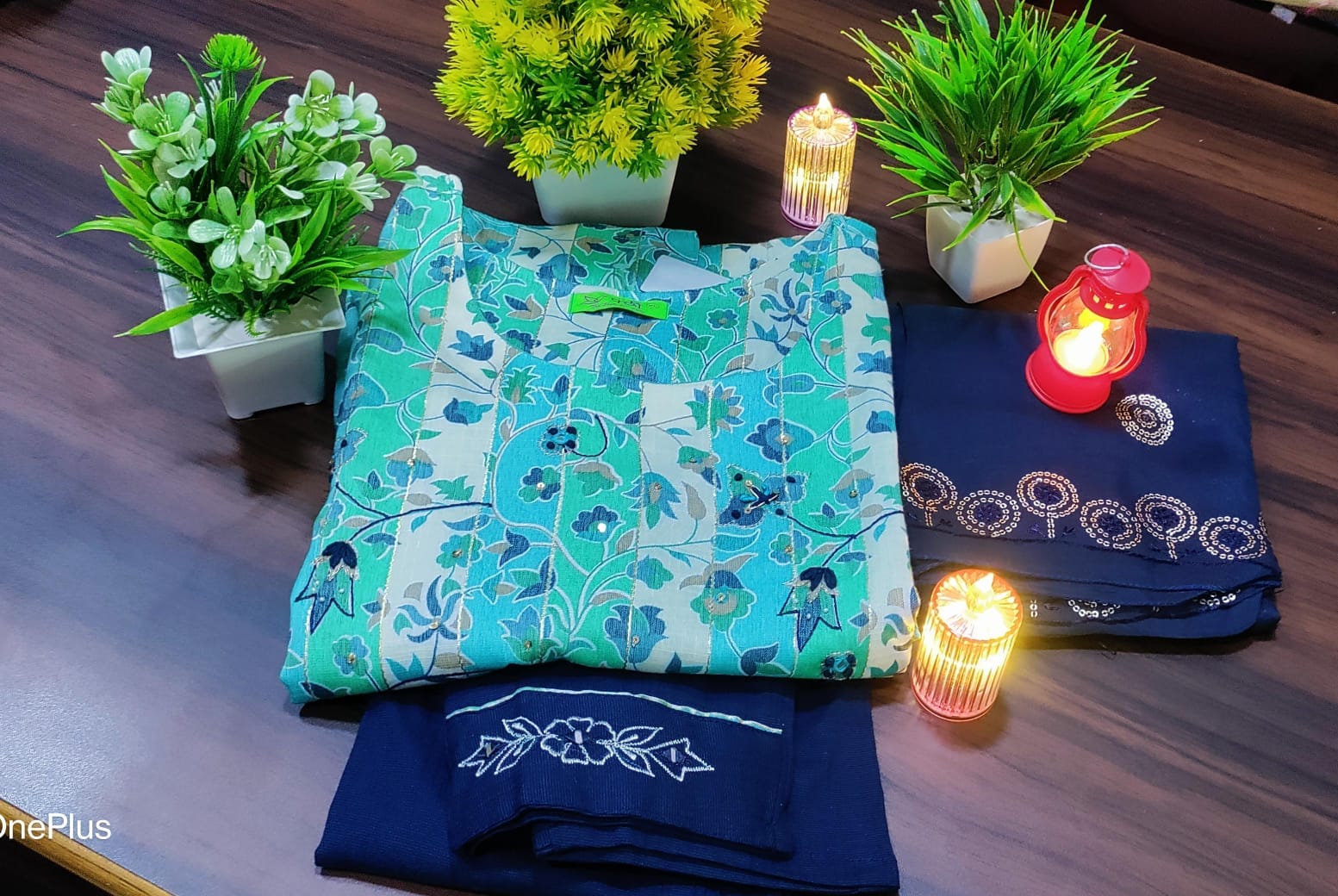 Be the first to review “Teal Motif Round Neck Cotton Kurti Set”