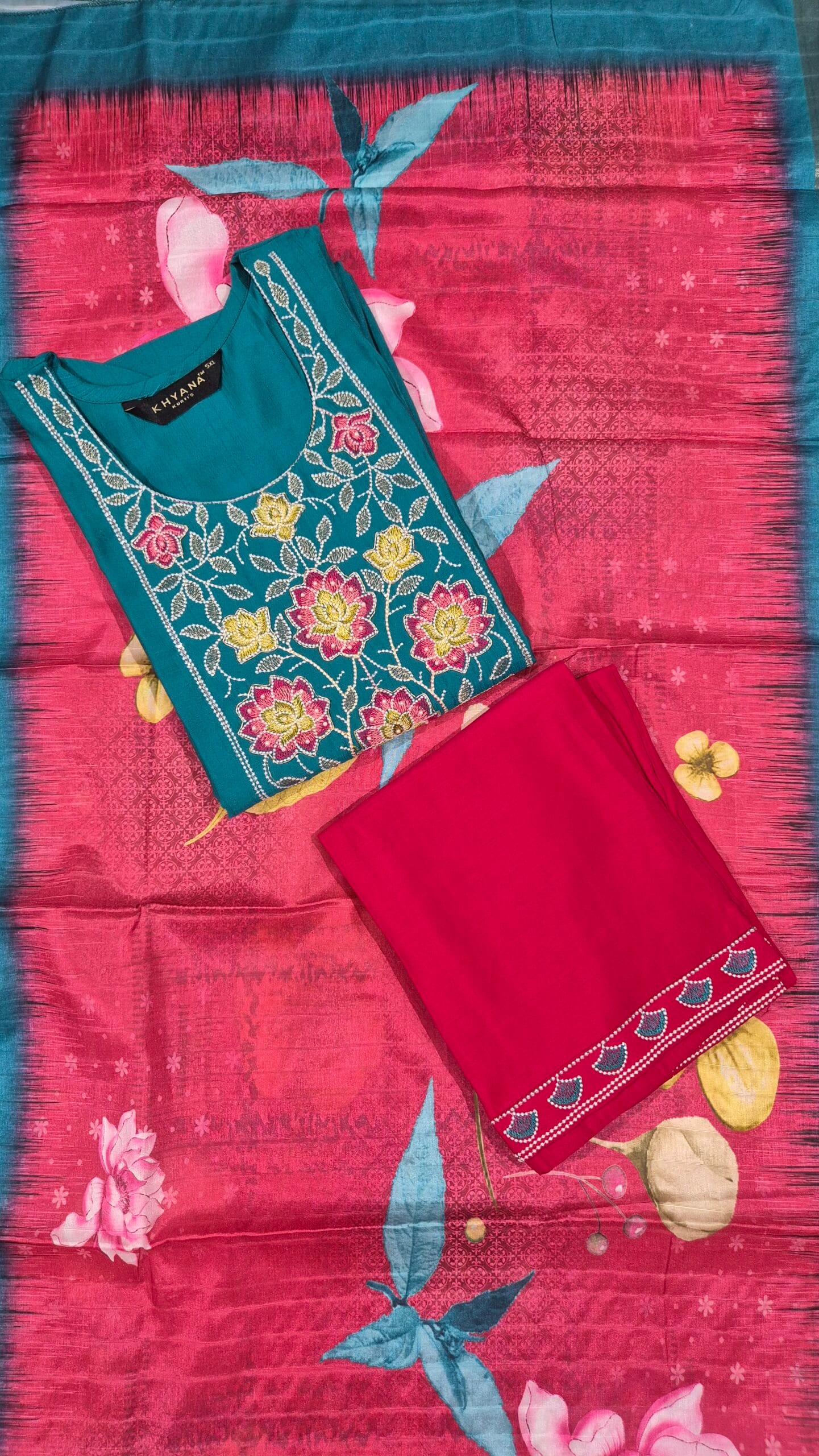 Be the first to review “Teal Pink Contrast Kurti Set with Bright Multi-Color Embroidery”
